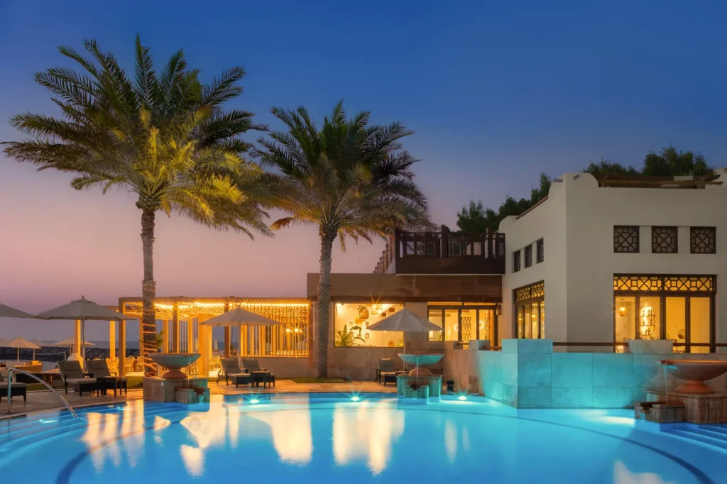 Die Architektur des Resorts knüpft an klassische arabische Formen an: warme Farben, filigrane Muster und weiche Linien schaffen eine Atmosphäre, die modern wirkt, aber tief im kulturellen Erbe der Region verwurzelt bleibt. Gäste schätzen vor allem die ruhige Lage und die direkte Strandnähe – ein abgeschiedener Rückzugsort mit Blick auf den Arabischen Golf.