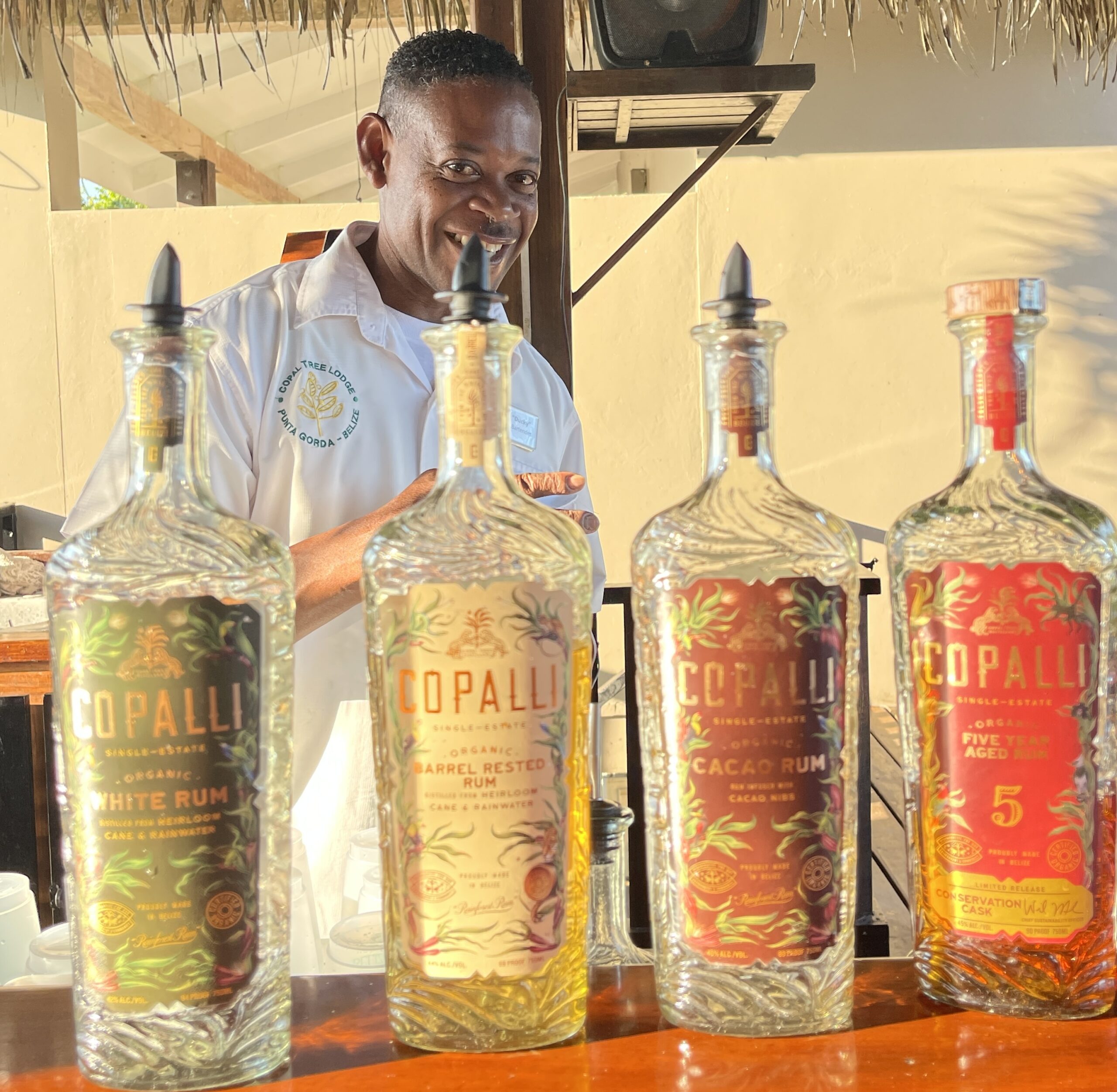 Nate steht am Rollfeld und bringt uns mit dem Jeep zur Copal Tree Lodge. Die Hotelanlage liegt auf einem Hügel mitten im Regenwald. Aus der sie umgebenden 3 000 Hektar großen Farm kommen die meisten Zutaten für die landestypischen Gerichte, die im Gartenrestaurant auf den Tisch kommen. Auch Kaffee und Kakao wachsen hier, und nicht zu vergessen – Zuckerrohr. Den daraus erzeugten Rum verkosten wir gleich bei einem Tasting. Ducky erklärt uns die Herstellung des Copalli Rums aus nur drei Zutaten – Zuckerrohr, Regenwaldwasser und Hefe, und er mixt wunderbare Cocktails. Der Liebling der Gäste – der frische und rosa im Glas leuchtende Watermelon Smash aus Rum, Minze, Limone und Melonenstücken.