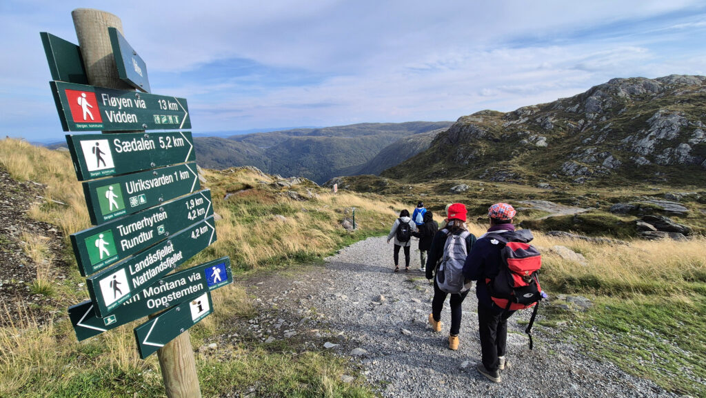 Auf Romantiker wartet etwas unterhalb des Fløiresrestauranten ein „kissing point“ mit vorgezeichneten Fußpositionen. Quasi ein Orientierungshilfe für Liebende und diejenigen, die im Alltag die Nähe zum Partner vernachlässigt haben. Ansonsten locken auf dem Fløyen Wanderwege, aber auch Bänke – für alle, die lieber sitzen und staunen.