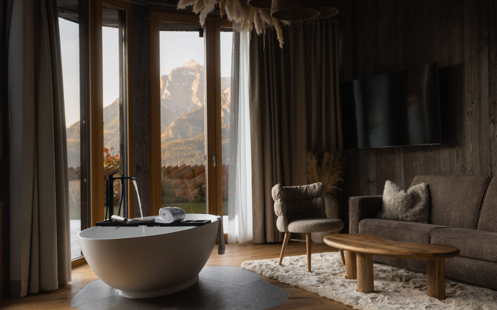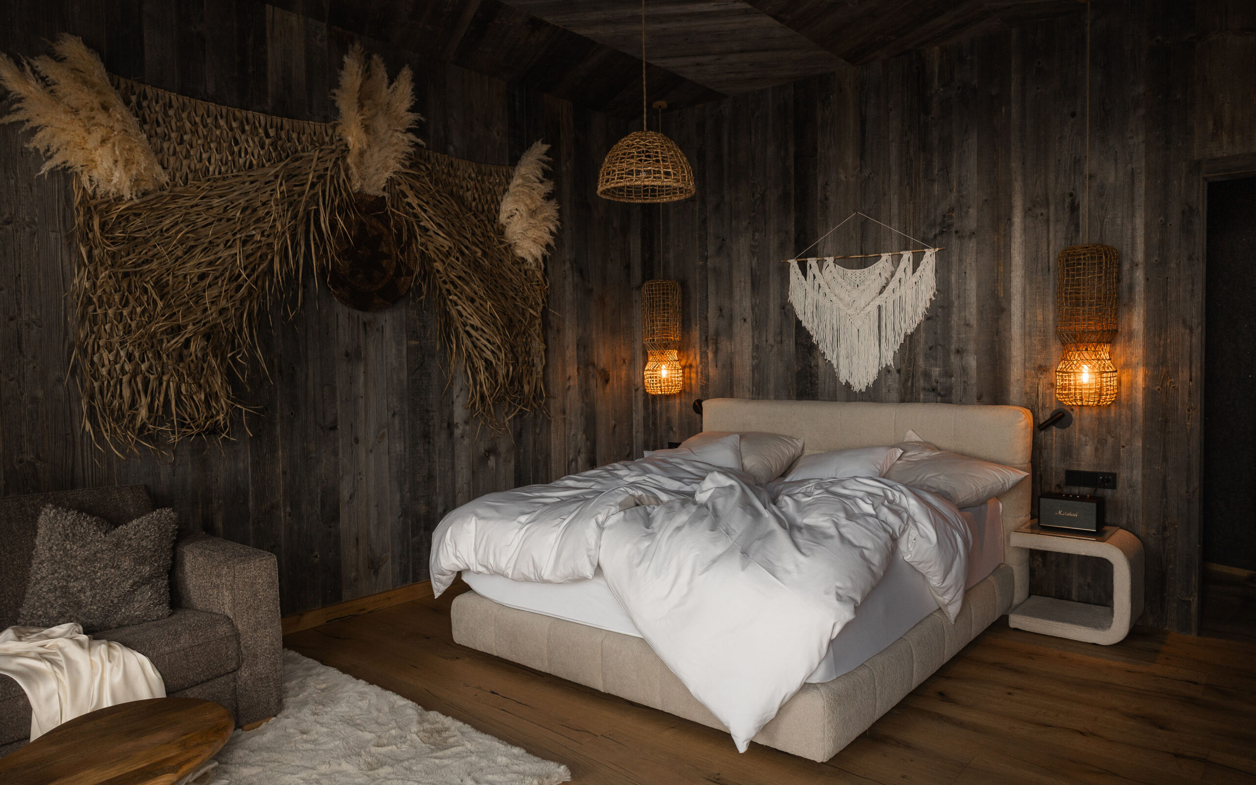 Mit acht neuen, liebevoll gestalteten Wohneinheiten erweiterte das Boho-Hotel Jufenalm sein Angebot auf insgesamt 38 Zimmer und Suiten. Die drei neuen Kategorien verbinden auf individuelle Weise Design, Natur, Panorama und private Spa-Momente geschickt, die alle das besondere Boho-Design und die Leichtigkeit innehaben. Die Sky Suite Himmelnah bietet auf rund 45 Quadratmetern einen luftigen Rückzugsort mit viel Licht und einem großen Balkon mit freiem Blick auf die Berge für bis zu fünf Personen. Auf Wunsch kann die Suite als Penthouse-Variante gebucht werden – mit noch mehr Weite und Aussicht durch den offenen Giebel.