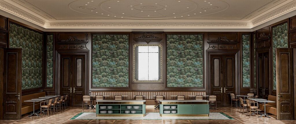 Viele verfügen über einen Blick in die begrünten Innenhöfe oder einen direkten Zugang zu diesen „inneren Gärten“. In der originalgetreu restaurierten Belle Etage ist die fürstliche Atmosphäre zahlreicher Ballabende in jedem Winkel spürbar.