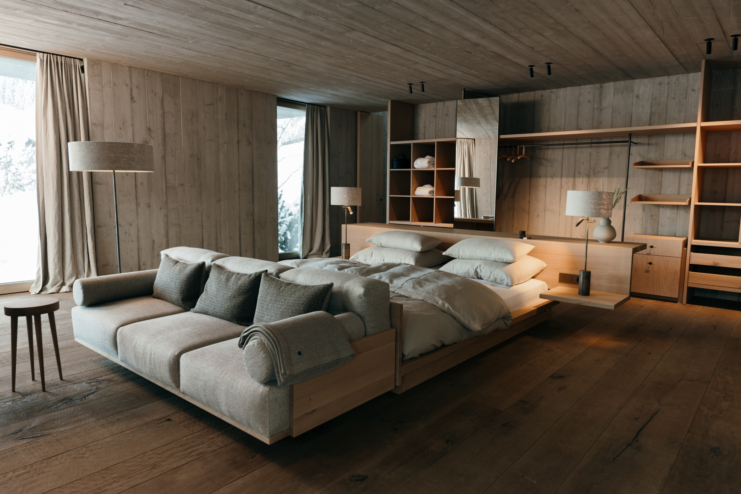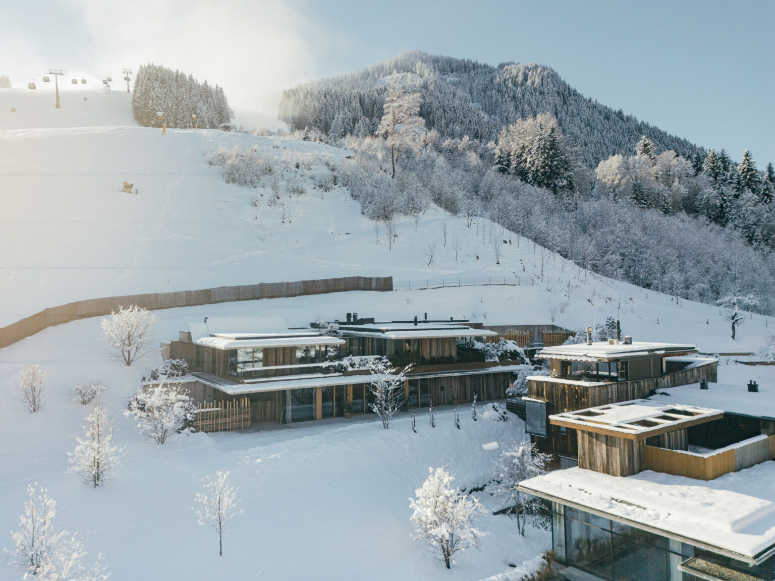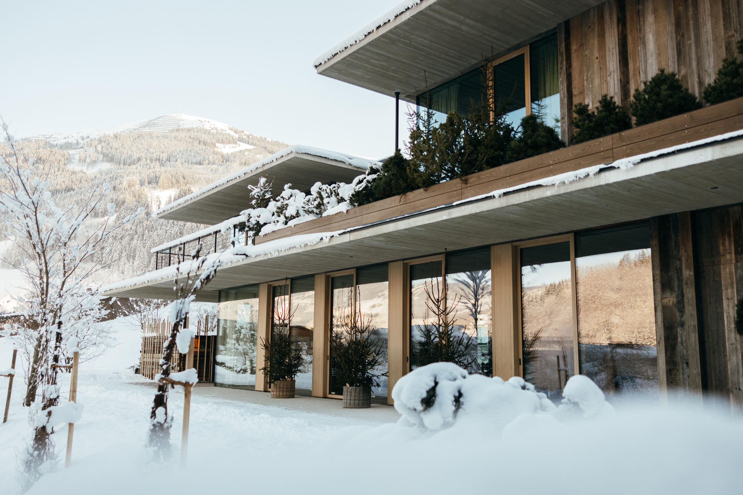 Der Inbegriff von Bergluxus: Eine eindrucksvolle Erweiterung wurde mit dem neuen Mountain Escape geschaffen. Die bereits bestehenden Suiten wurden um ein Berg-Loft und eine Berg-Suite sprichwörtlich in neue Sphären gehoben, das Berg-Gym bietet State-of-the-Art-Fitness für höchste Ansprüche. Hohe, lichtdurchflutete Räume, viel Holz und Glas sowie ausgewählte Materialien und begrünte Dächer zeichnen die neuen Räumlichkeiten aus – spektakulär in den Hang hineingebaut und dem Haupthaus gegenüberliegend. Auf sagenhaften 360 Quadratmetern erstreckt sich das Berg-Loft in modern-reduziertem Look mit drei Schlafzimmern und Bädern sowie grosszügigem Wohnbereich und hochwertig ausgestatteter Küche, alles um ein lichtspendendes Atrium gruppiert. Für das ultimative Wohnerlebnis gesellen sich ein eigener 15 Meter langer Pool mit Terrasse, ein Fitnessbereich mit Sauna und diverse weitere Annehmlichkeiten dazu.