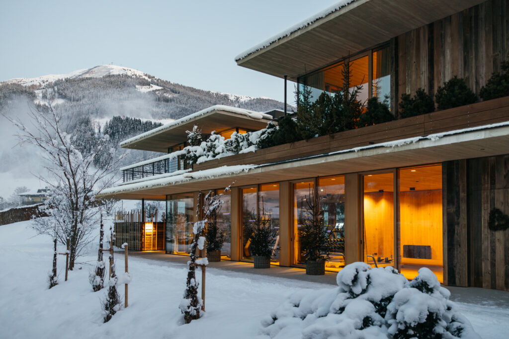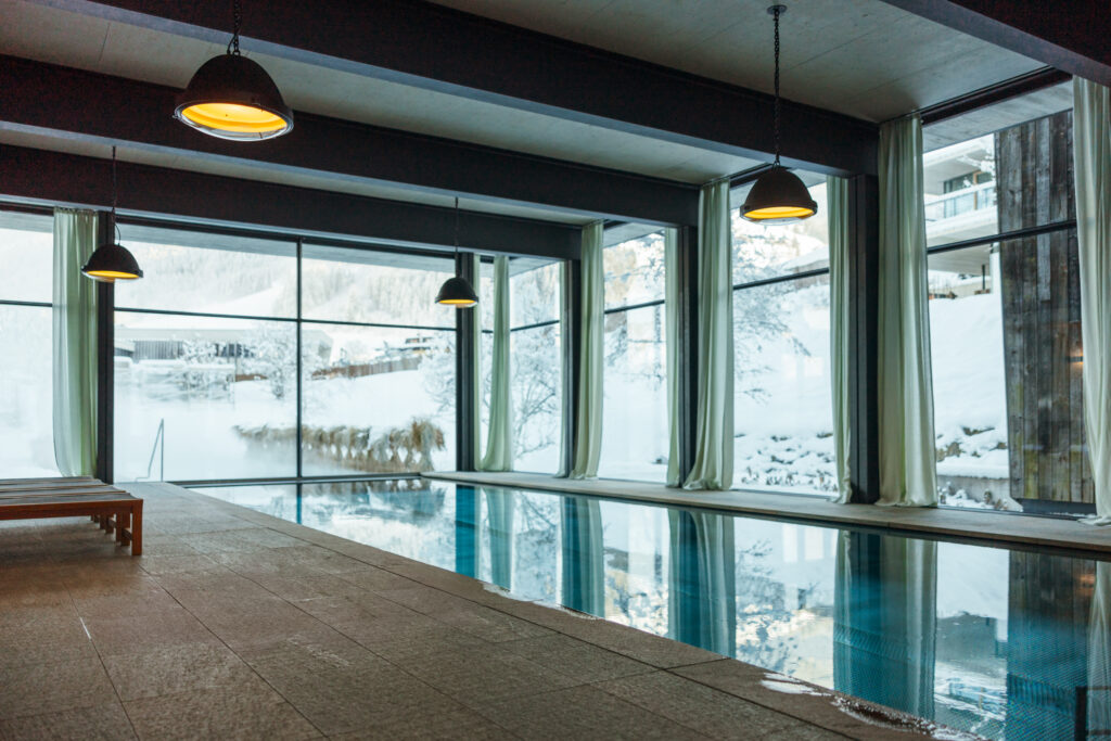 Verteilt auf drei Ebenen warten ein Indoorpool, zwei Massageräume, ein Kosmetikraum, eine Piniensauna, ein Dampfbad, der Panorama-Ruheraum sowie die Tee-Lounge mit offenem Feuer und Blick in die Glemmtaler Bergwelt im Bad-Haus auf die Gäste. Das Highlight ist der beheizte Innen- und Outdoorpool, gefüllt mit reinstem Wasser aus der eigenen Quelle. Im gewohnt reduzierten und gleichzeitig naturverbundenen Design fügt sich der Aussenpool sanft in die umliegenden Wiesen und Weiden ein. Integrierte Massageliegen und spezielle Düsen sorgen für zusätzliche Entspannung.