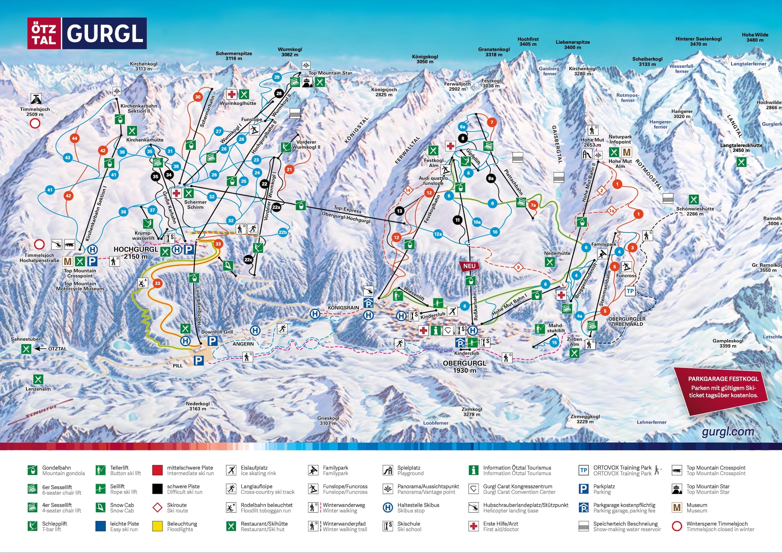 Das Skigebiet Gurgl besteht aus zwei großen Teilgebieten, die mit der Panorama-Gondelbahn „Top-Express“ verbunden sind. Das Skigebiet in Hochgurgl besticht mit vielen einfachen Pisten, einer Nachtrodelbahn und einer spektakulären, rundum verglasten Panoramabar auf dem Wurmkogl (3.082 m). Im Top-Mountain-Star kann man bis zu den Dolomiten blicken. Anschließend geht es über die mit 8 Kilometern längste Abfahrt zurück ins Tal. Das Skigebiet Obergurgl glänzt dagegen mit einem gut ausgestatteten Snowpark am Festkogl (3.038 m) und vielen anspruchsvollen Abfahrten an der Hohen Mut (2.670 m). Weitere Aktivitäten im Skigebiet Gurgl sind Langlauf auf Höhenloipen, geführte Skitouren und Winterwanderungen durch den Schnee.
