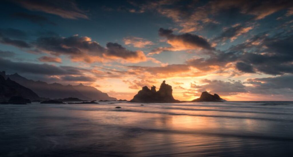 Im Schatten der beeindruckenden Felsen von Anaga gehört der Sonnenuntergang an der Playa de Benijo auf Teneriffa zu den schönsten der gesamten Inselgruppe. In den Abendstunden färbt sich der Himmel Violett, Rot und Gold, während sich die bizarren Gesteinsformationen vor der Küste sehenswert aus dem Meer erheben. Um von der Inselhauptstadt Santa Cruz de Tenerife nach Benijo zu gelangen, fahren Reisende in Richtung Norden, vorbei an dem Städtchen Taganana, immer entlang der Küste. Benijo selbst ist eine verschlafene kleine Gemeinde mit vielen kleinen Restaurants – über eine Treppe geht es, pünktlich zum Sonnenuntergang, mühelos hinab zum Strand.
